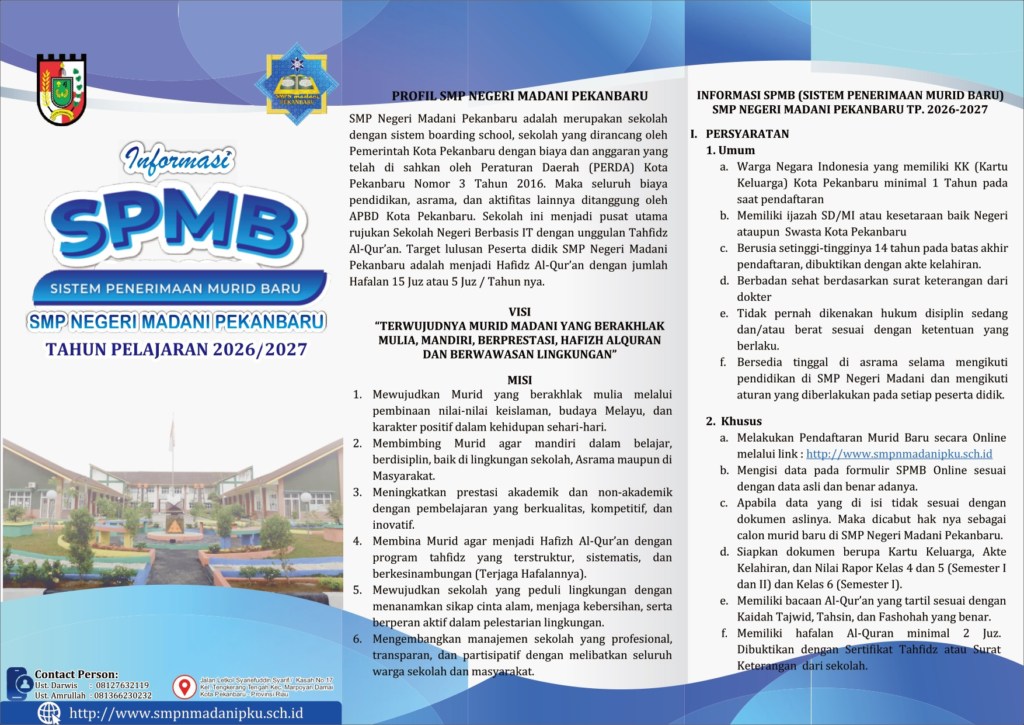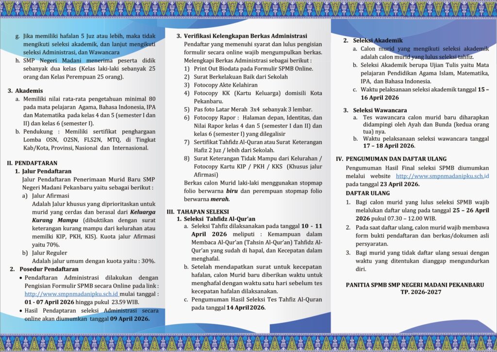 Pekanbaru – Panitia Sistem Penerimaan Murid Baru (SPMB) SMP Negeri Madani Pekanbaru kembali menyampaikan informasi penting terkait pelaksanaan seleksi Tahfidz